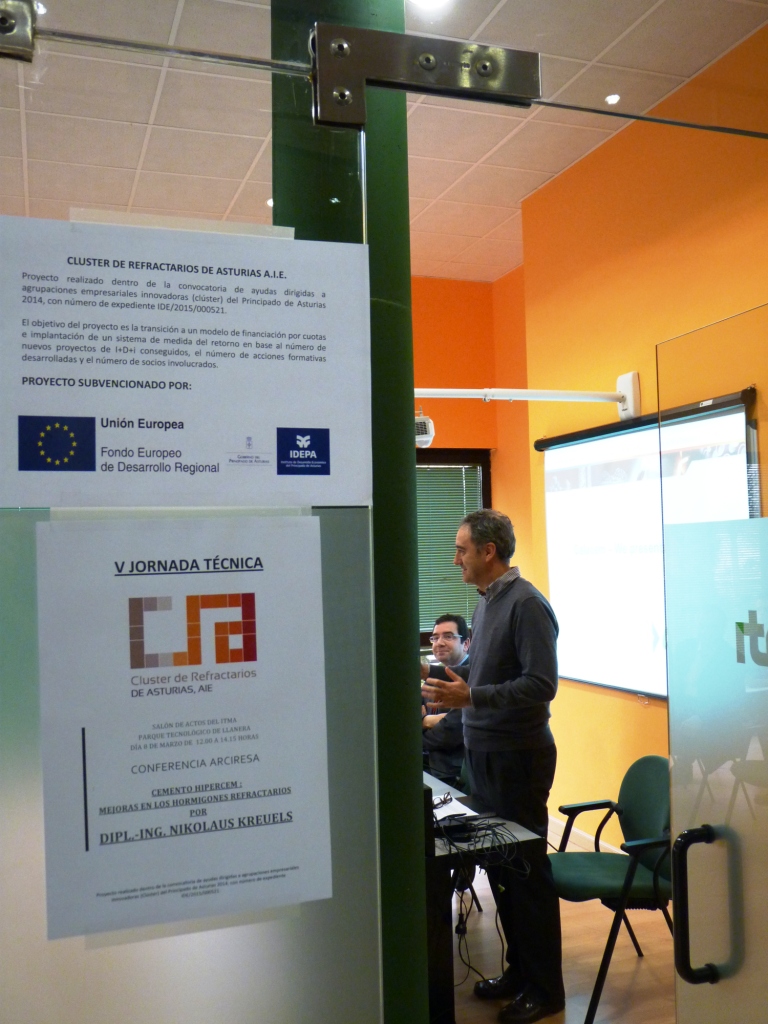 V Jornada Técnica del Clúster de Refractarios de Asturias (2016) El martes 7 de Marzo de 2016, a las 12.00 h, en el Salón de Actos de la Fundación ITMA en Llanera se celebrará la Jornada Técnica del Clúster de Refractarios de Asturias. Bienvenida: Fernando López - Director de Arciresa Manuel Miranda – Administrador Clúster de Refractarios de Asturias A.I.E. 1. HIPERCEM 2. TECHNICAL APPROACH HIPERCEM 3. COST APPROACH HIPERCEM 4. QUESTIONS & ANSWERS FOTOS DE LA JORNADA: